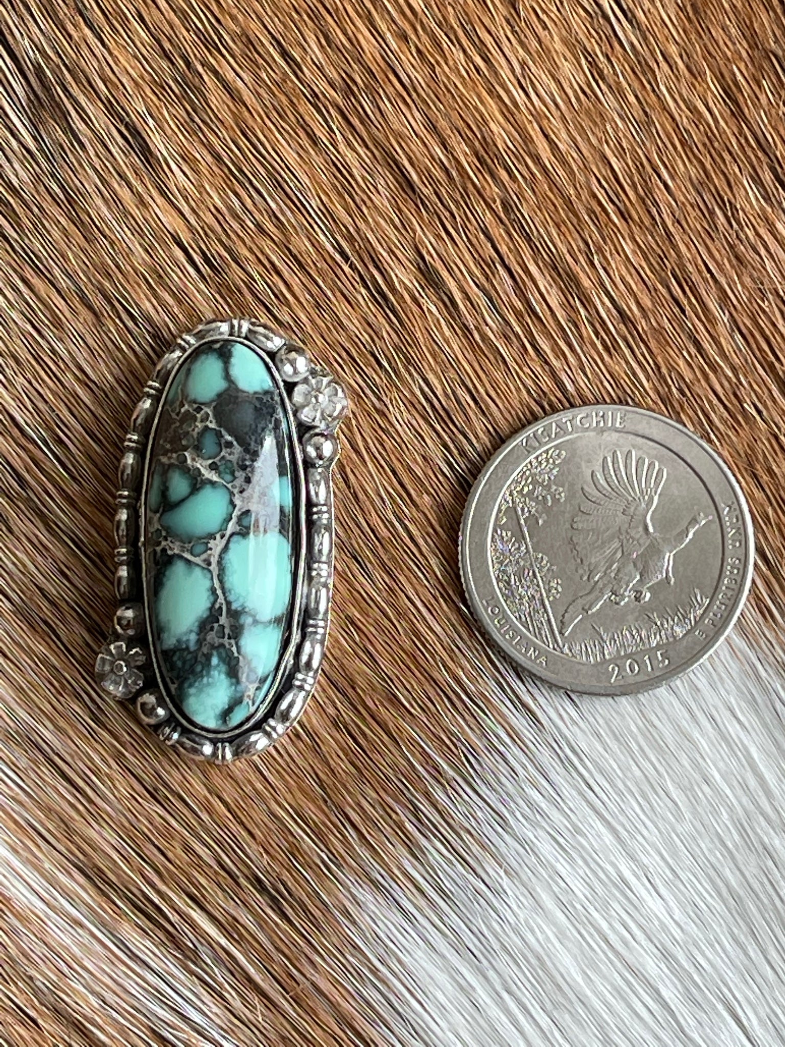 Another day, another Calypso. This pretty little thing is accented with hand forged flowers and spheres. Wrapped in fine and set in sterling silver.