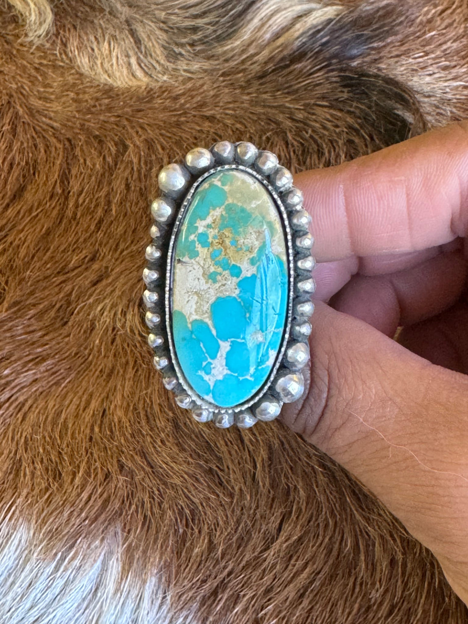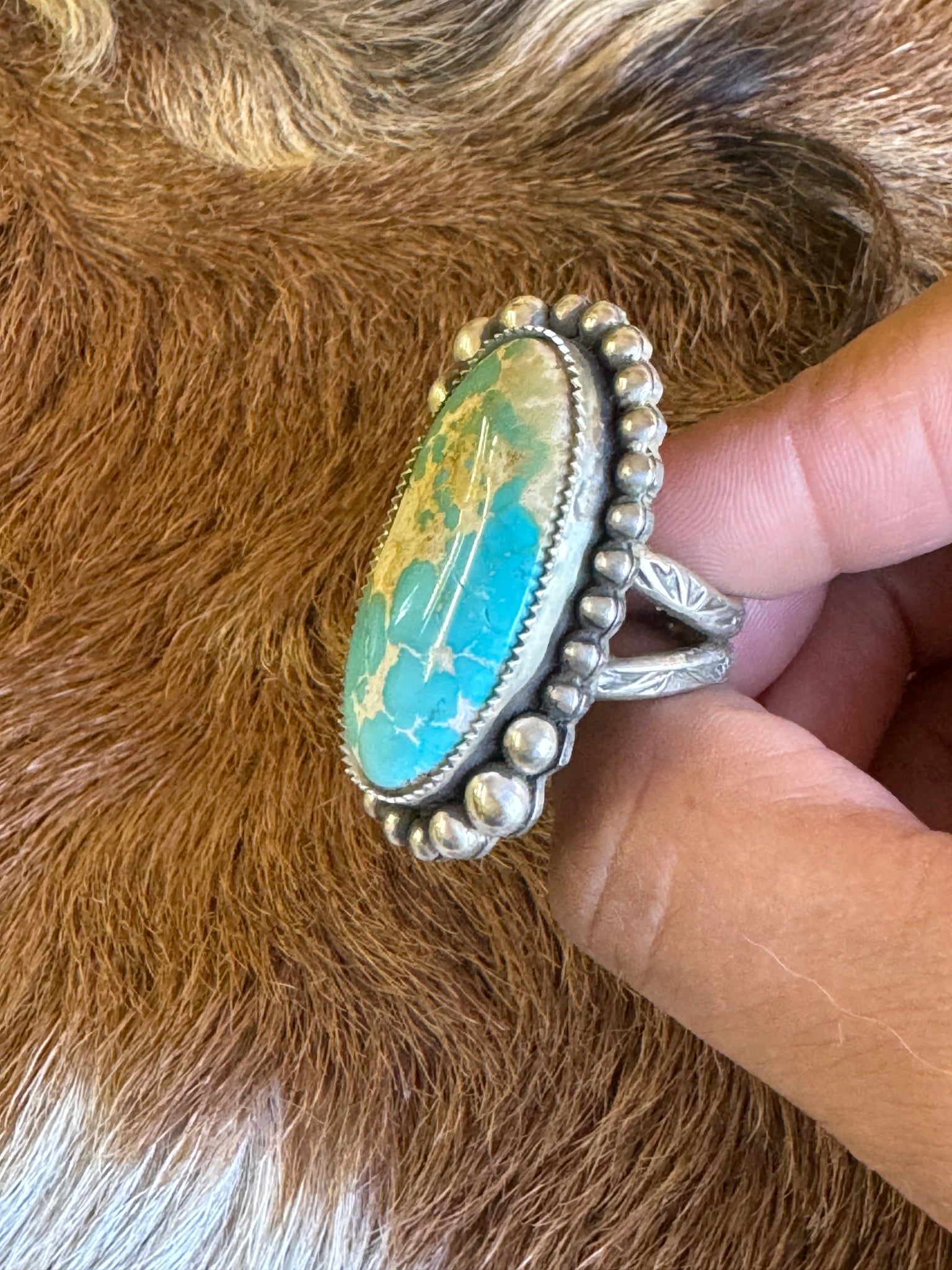 This stunning ring features a large, oval-shaped Royston turquoise stone, measuring approximately 1.7 inches by 1 inch. The stone showcases a captivating mix of light blue, with natural creamy matrix pattern that make it truly unique. It's set in a handcrafted fine and sterling silver bezel, adorned with a beaded border for added elegance. Finished to size, this statement piece is perfect for adding a touch charm to any outfit.