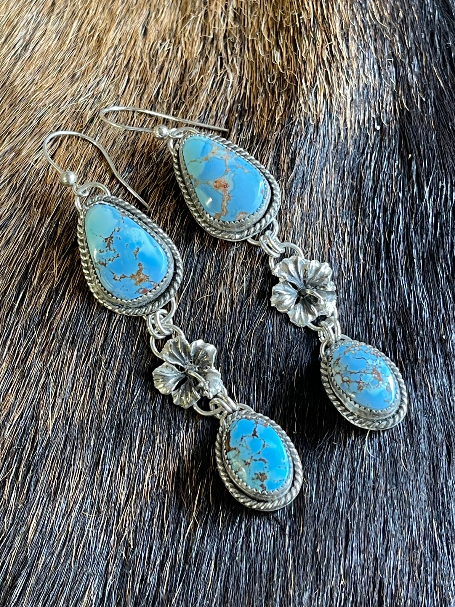 These beautiful blue Golden Hill turquoise stones are paired up with the most fun hibiscus flower castings. Stones are set in fine and sterling silver. These are them perfect weight. Not too light, not too heavy.