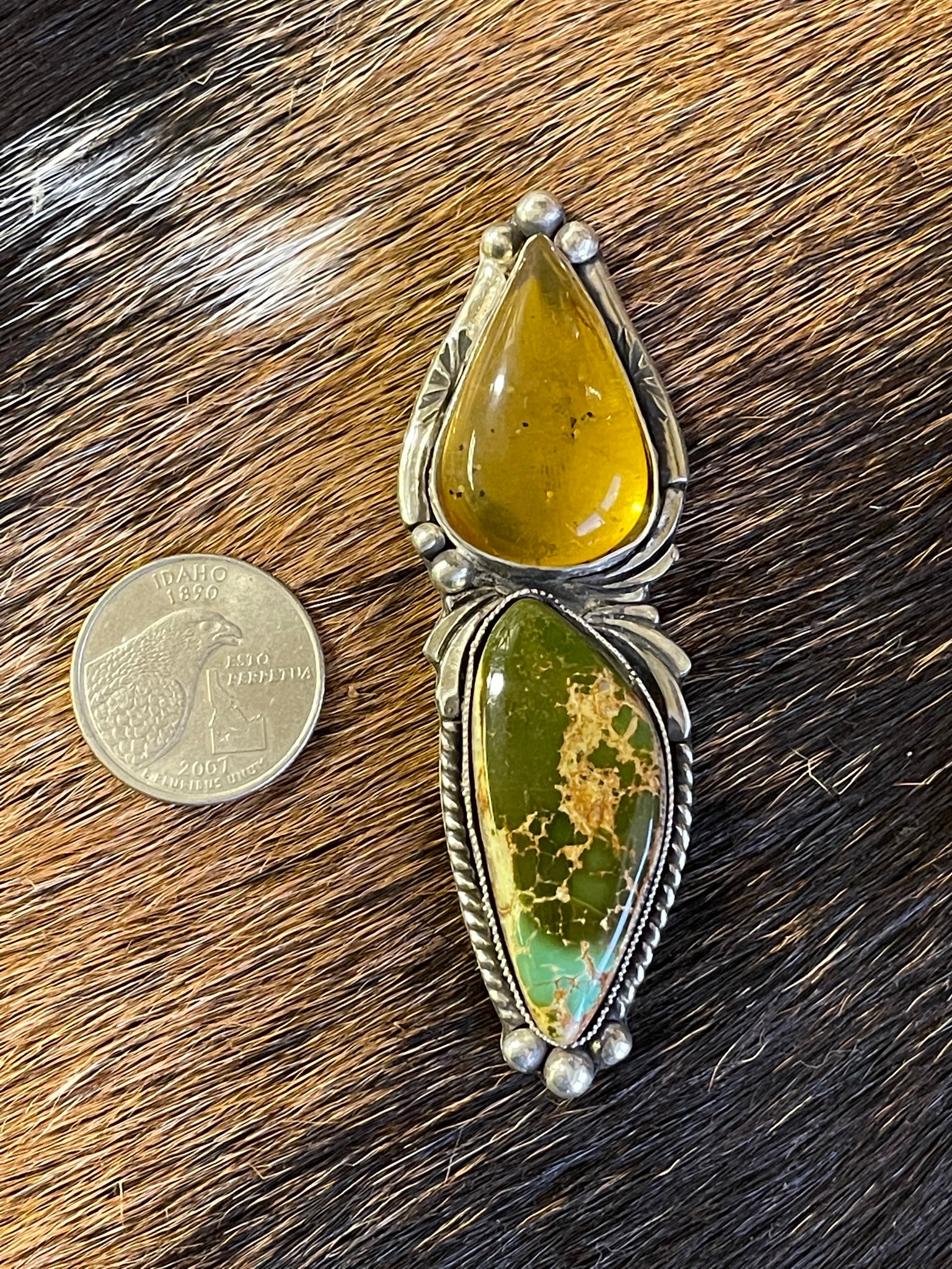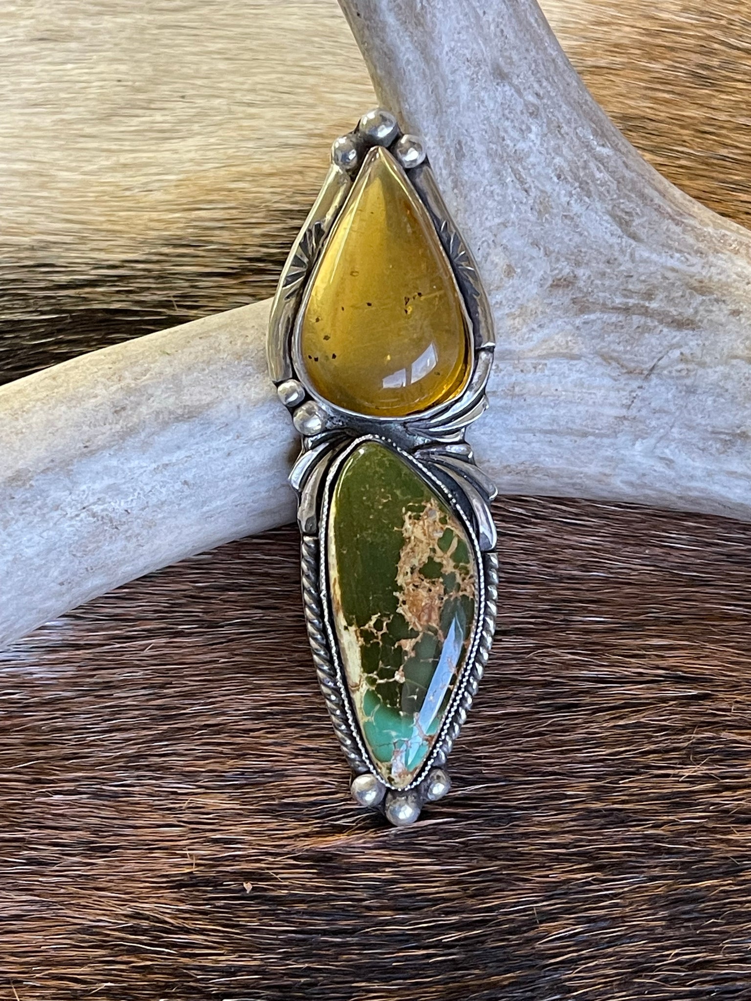 Beautiful Montezuma Royston and Chiapas Amber statement piece. Stones are wrapped in a fine silver bezel, set amount sterling silver. Piece can be finished as a ring, or pendant (that will come with a 18-20 inch chain).