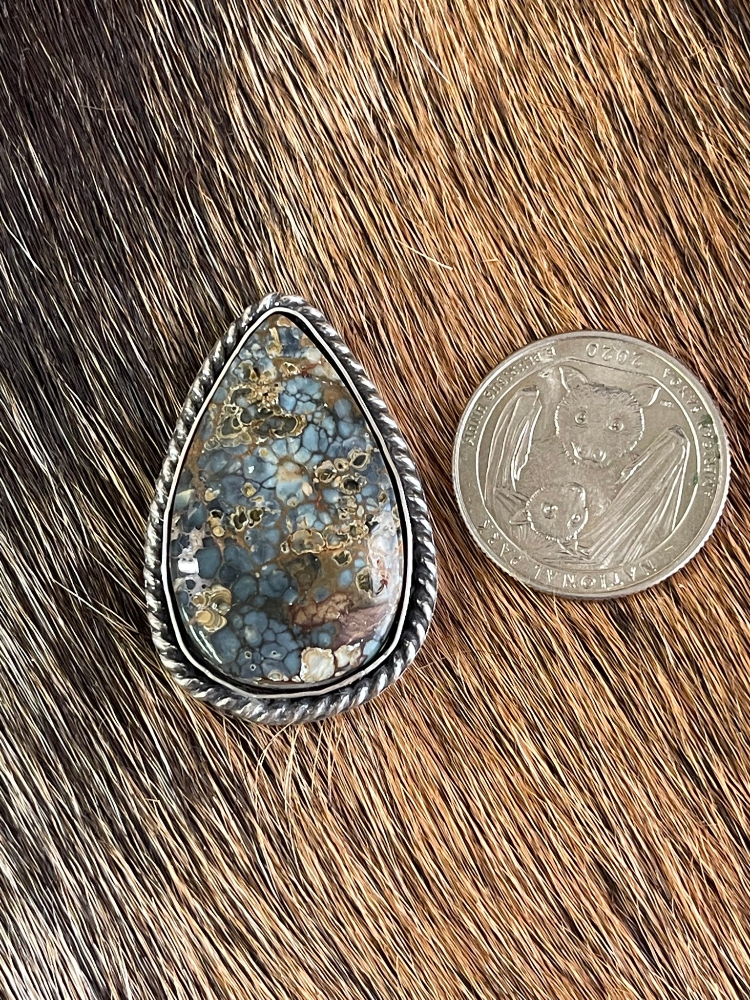 Discover the enchanting allure of this rare and breathtaking Seven Dwarves Variscite, a gemstone that embodies captivating shades of beautiful blue with glimmers of gold intricately woven within its webby matrix. This spectacular stone is elegantly cradled within a fine silver bezel, complemented by exquisite sterling silver craftsmanship throughout.
